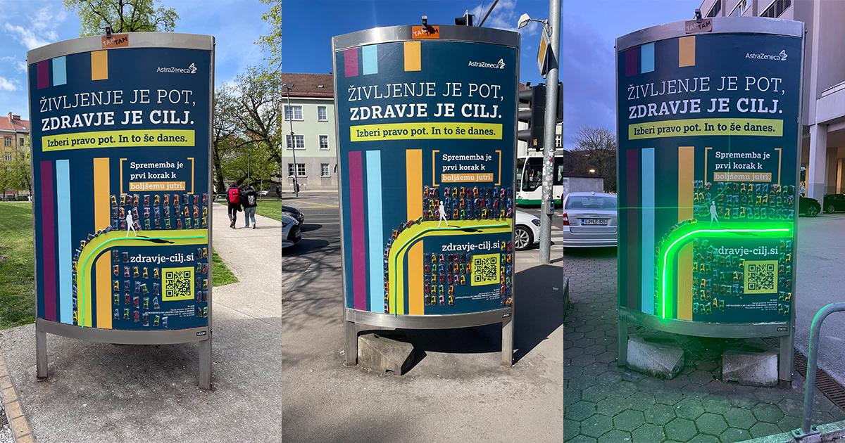 Za AstraZeneca smo mestne plakate na več lokacijah po Sloveniji (Ljubljana, Maribor, Celje, Kranj) nadgradili v interaktivne točke, ki sporočilo prenesejo tudi v prostor.