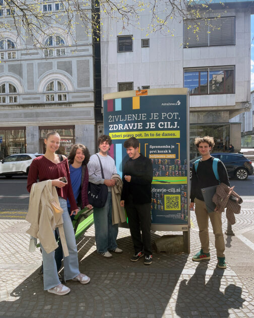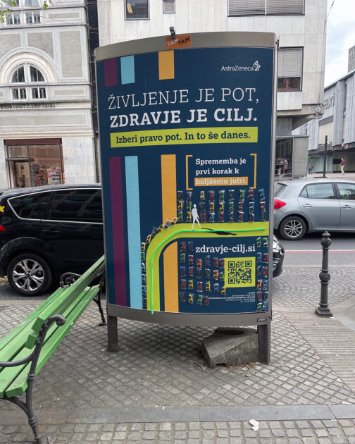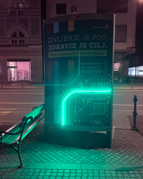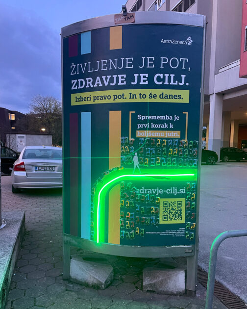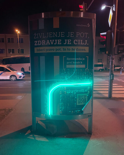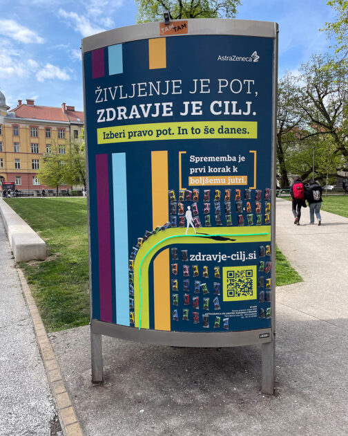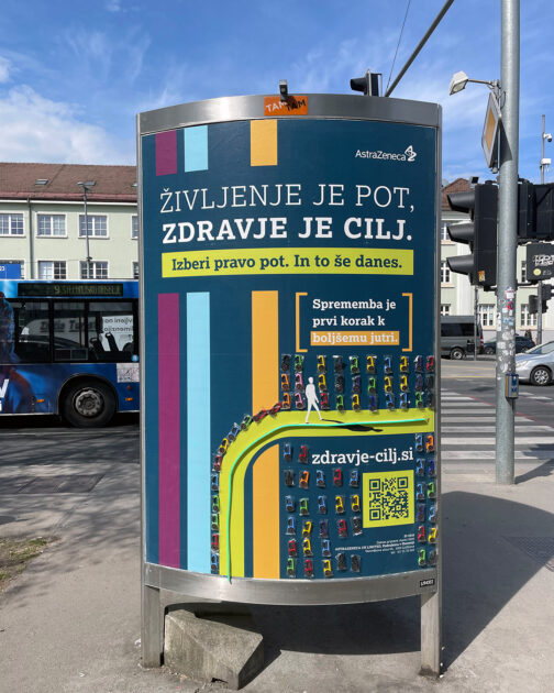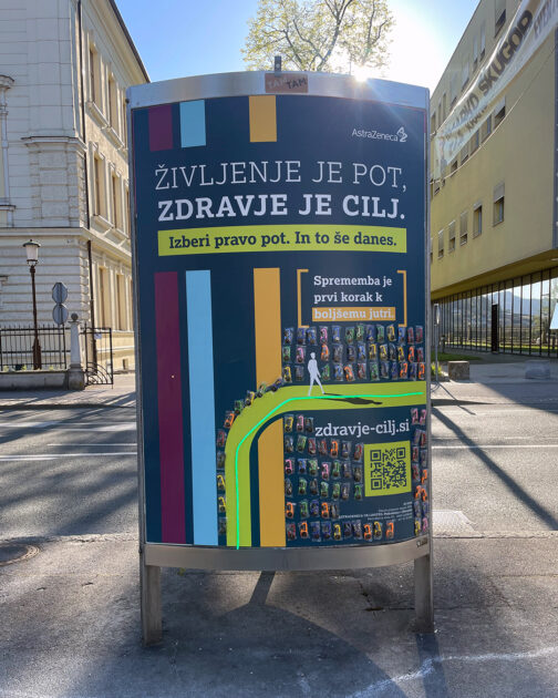 Za AstraZeneca smo mestne plakate na več lokacijah po Sloveniji (Ljubljana, Maribor, Celje, Kranj) nadgradili v interaktivne točke, ki sporočilo prenesejo tudi v prostor.